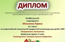 Дипломами за 1 место во всероссийской специальной олимпиаде для детей с ОВЗ награждены Мочалина Л.,Загитова З.воспитанники 1 группы.Руководитель Салахова Г.А.