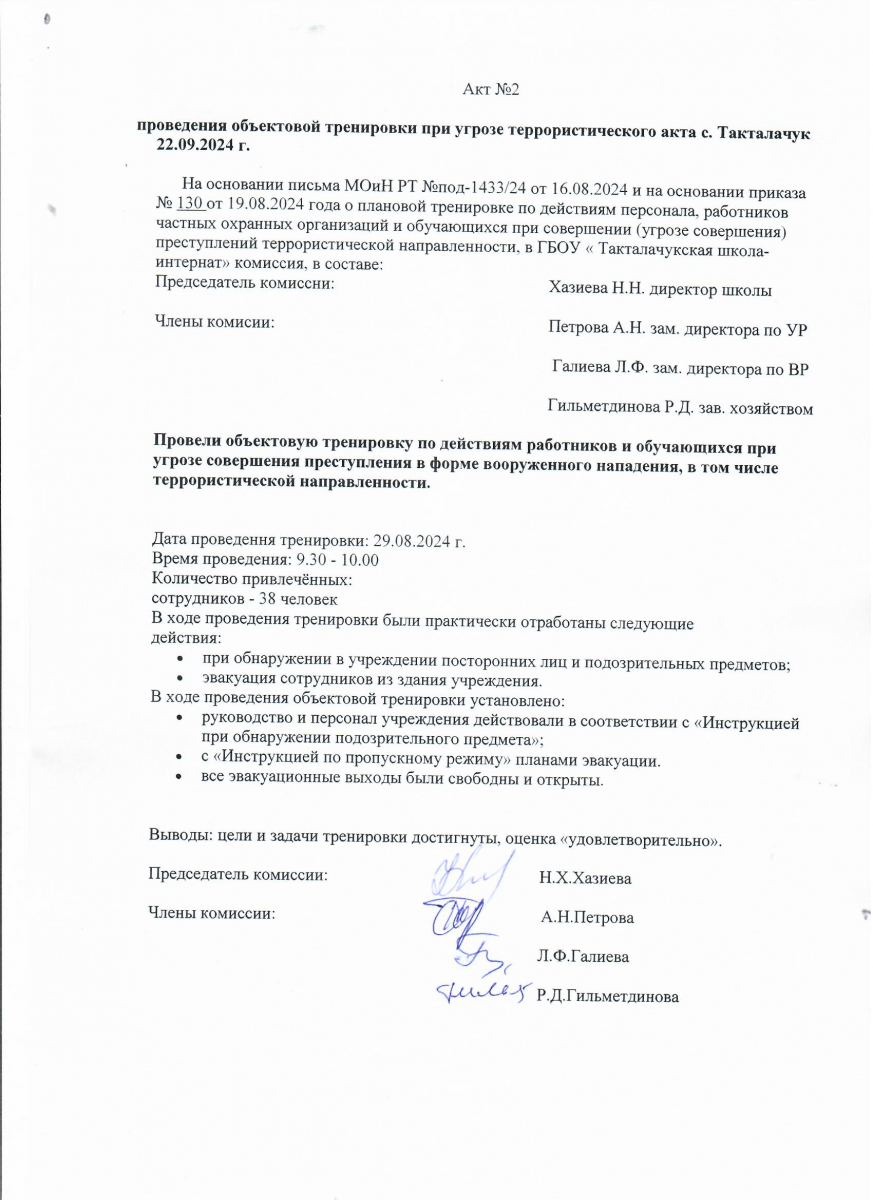 АКТ 2 проведения объективной тренировки при угрозе террористического акта,с.Такталачук.