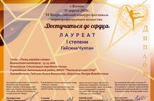 VI Бөтенрәсәй хореография сәнгате конкурс-фестивалендә 7 нче класс укучысы Гайсина Чулпан икеләтә уңышка ирешеп, 1 нче дәрәҗә лауреат булды. Котлыйбыз! Афәрин!