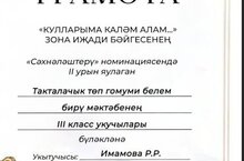 Минзәлә шәһәрендә оештырылган "Кулларыма каләм алам" зона иҗади бәйгесендә 3 нче класс укучылары "Сәхнәләштерү" номинациясендә 2 урынга лаек булдылар. Җитәкче: Имамова Р. Р.