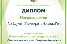 Заповедный урок.рф дипломы 03.03.2017 28нче февраль көнне "Бөтенроссия тыюлыклары дәресләре" проекты нигезендә безнең мәктәптә биология укытучысы Хабиров Г.А.тарафыннан Татарстандагы тыюлыклар турында башлангыч Һәм 5-9нчы классларга дәресләр үткәрде. Бу дәресне үткәрү өчен "Заповедный урок.рф" сайтында регистрация үтеп, материаллары кулланылды, соңыннан экология министрлыгына отчеты җибәрелде.Чарада актив катнашкан өчен мәктәп рәхмәт хаты белән, биология укытучысы Хабиров Г.А. диплом белән бүләкләнде.
