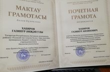 Почетная Грамота МОиН РТ 29.01.2021 Яшь буынга белем һәм тәрбия бирү системасына керткән зур өлеше, күпьеллык намуслы хезмәте өчен биология укытучысы Хабиров Газинур Әнҗәп улы ТР Мәгариф һәм фән министрлыгының Мактау Грамотасы белән бүләкләнде./ За весомый вклад в систему образования и воспитания подрастающего поколения и многолетний добросовестный труд учитель биологии Хабиров Газинур Анзяпович награжден Почетной Грамотой МОиН РТ.