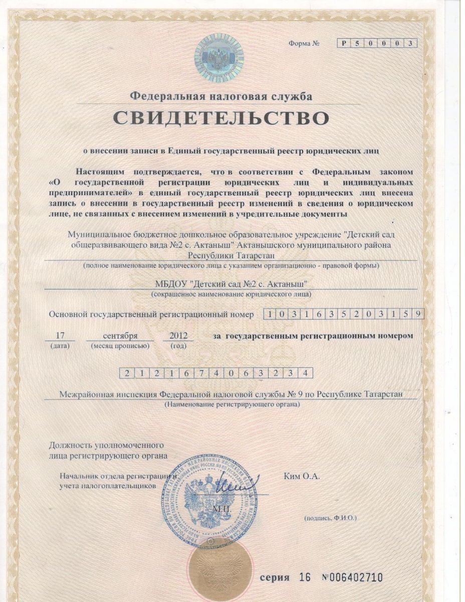 Короткое название: МБДОУ «Детский сад №2 с. Актаныш»
