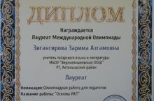 Учитель татарского языка и литературы МБОУ "Верхнеяхшеевская ООШ" Зигангирова Зарима Азгамовна награждена дипломам Лауреата Международной Олимпиады в номинации "Олимпиадная работа для педагогов".Название работы: "Основы ИКТ".Поздравляем!