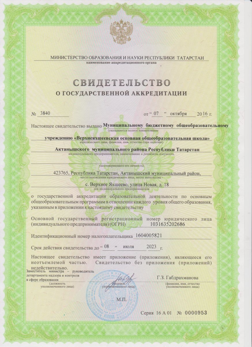 Муниципальное бюджетное общеобразовательное учреждение «Верхнеяхшеевская основная общеобразовательная школа» Актанышского муниципального района Республики Татарстан / Татарстан Республикасы Актаныш муниципаль районы "Югары Яхшый төп белем бирү мәктәбе муниципаль бюджет гомуми белем бирү учреждениесе"
