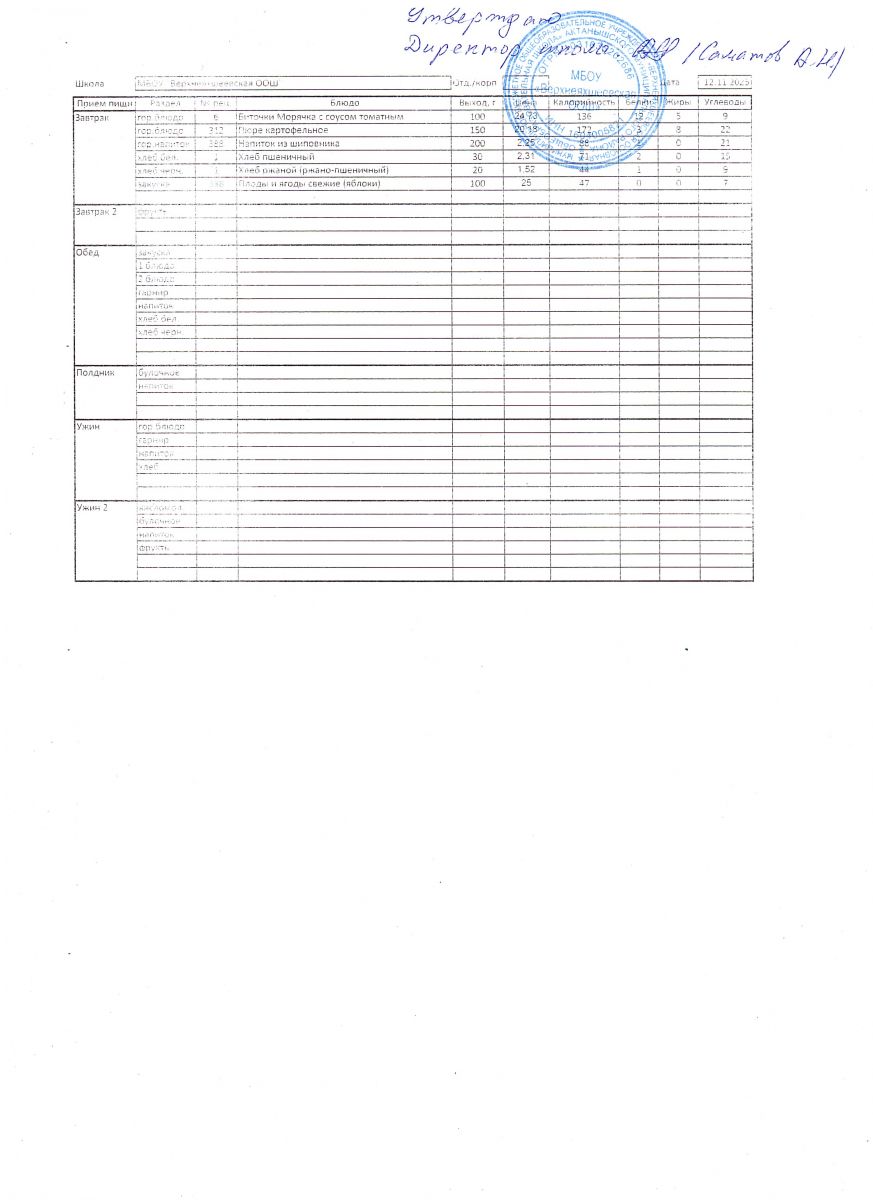 примерное двенадцатидневное меню для организации бесплатного питания в начальных классах