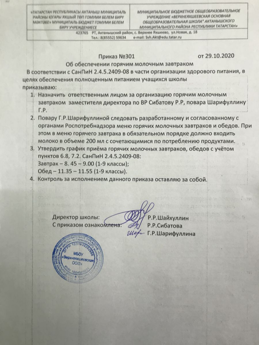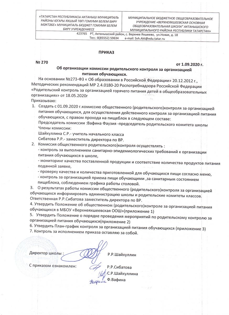 Приказ о назначении ответственного за прием продуктов питания обучающихся