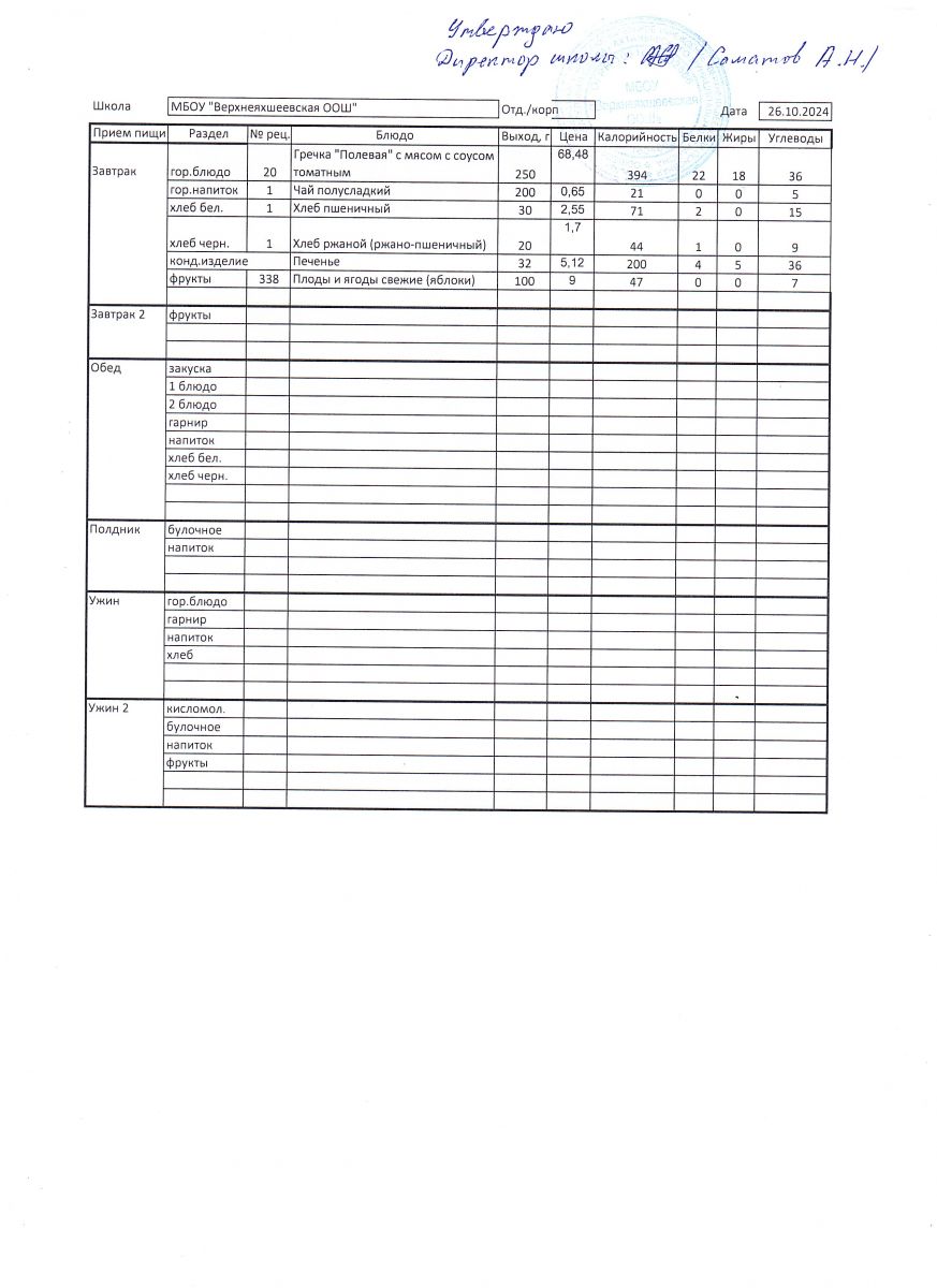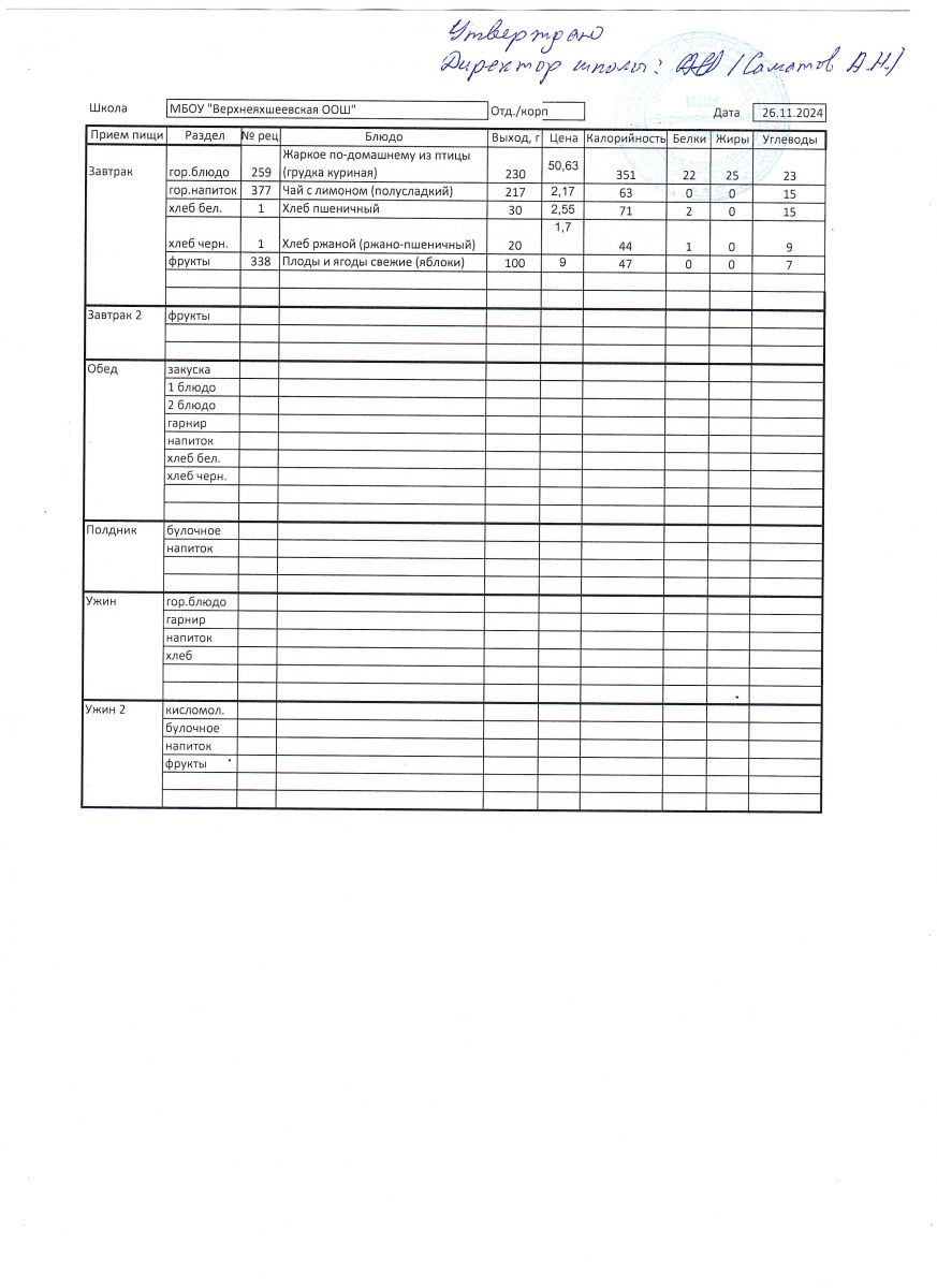 Однодневное меню на 26.10.2023 Однодневное меню на 27.10.2023