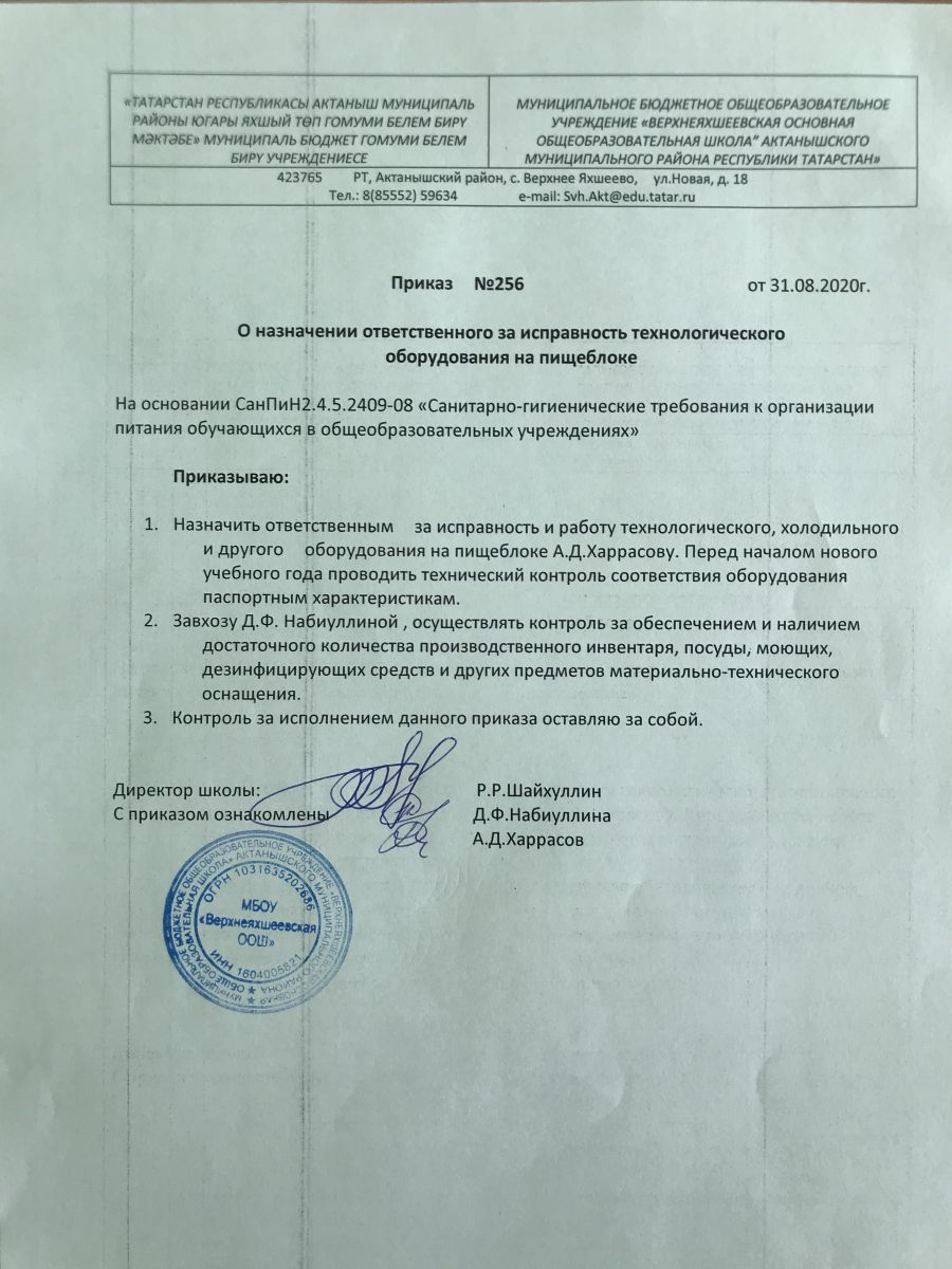 Приказ о назначении ответственного за исправность технологического оборудования на пищеблоке
