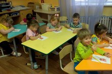 Дети младшей группы на занятии по рисованию закрепляли умение рисовать предметы круглой формы, повторять изображение, заполняя свободное пространство листа. Детям очень понравились упражнения с обручами.