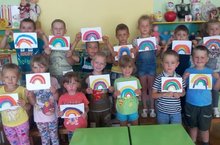 Дети подготовительной группы совместно с воспитателем сделали аппликацию на тему: "Радуга-дуга", учились подбирать цвет, вырезать ножницами нужные по размеру дуги. Занятие доставило детям много радости и удовольствия.