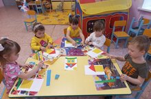 На занятии дети средней группы делали аппликацию "Большой дом" У детей закреплялось умение резать полоску по прямой.