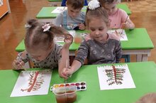 На занятии по рисованию дети старшей группы учились рисовать фруктовое дерево, передавая его характерные особенности: ствол с расходящимися кверху ветками, яблоки