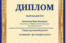 Подведены итоги районного конкурса экологической социальной рекламы "Город под защитой детства". Поздравляем наших воспитанников Лошкарев И. - 1 место, Сагдеева М- 2 место, Хамзина В. - 3 место, Андреев А - 1 место и руководителей. Воспитатель Хусаинова В.И. - 3 место. Поздравляем.