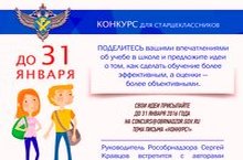 Федеральная служба по надзору в сфере образования и науки призывает старшеклассников делиться предложениями, как сделать обучение более эффективным. "Поделитесь вашими впечатлениями об учебе в школе и предложите идеи, как сделать обучение более эффективным, а оценки — более объективными", - говорится в сообщении Рособрнадзора, опубликованном на странице ведомства в соцсети. Идеи можно присылать до 31 января 2016 года на адрес электронной почты concurs@obrnadzor.gov.ru с темой письма "КОНКУРС!". Сообщается также, что руководитель Рособрнадзора Сергей Кравцов встретится с авторами лучших идей и обсудит их реализацию. Также победителей ждут подарки.