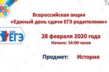 Всероссийская акция «Единый день сдачи ЕГЭ родителями» по предмету "История" 19.02.2020 Уважаемые родители! МКУ «Отдел образования Алексеевского муниципального района РТ» приглашает Вас принять участие во Всероссийской акции «Единый день сдачи ЕГЭ родителями» по предмету "История", инициатором которой выступает Федеральная служба по надзору в сфере образования и науки.Мероприятие будет проходить 28 февраля 2020 года на базе МБОУ Алексеевской СОШ №3 им.Г.С.Боровикова в 14:00 часов.