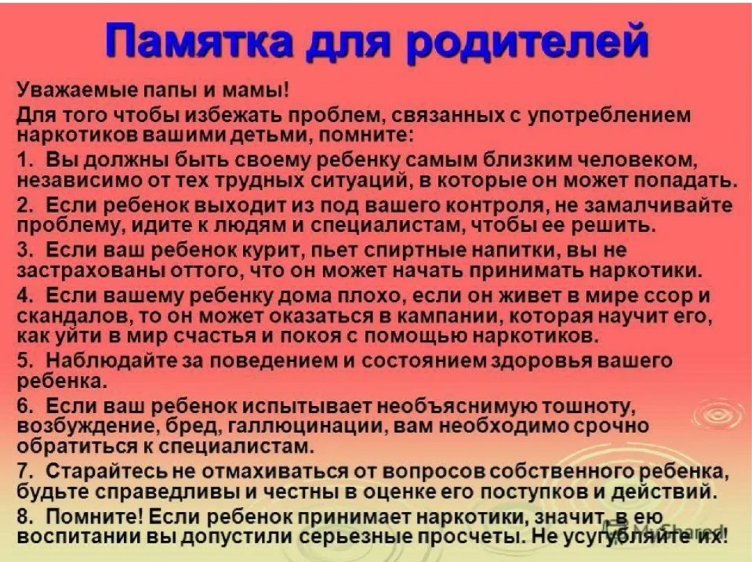 Для родителей учащихся были изготовление памятки по профилактике употребления табака, электронных сигарет, наркотических и психотропных веществ, в которых родителям даны рекомендации, которые помогут им вовремя оградить своего ребенка от проблемы зависимости.