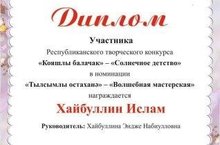 Тәрбияче Хәйбуллина Э. балалар бакчасында тәрбияләнүче Хэйбуллин И. белән республикакүләм "Тылсымлы остаханә" исемле иҗади конкурсында катнашып катнашучы Дипломы белән бүләкләндекләр.