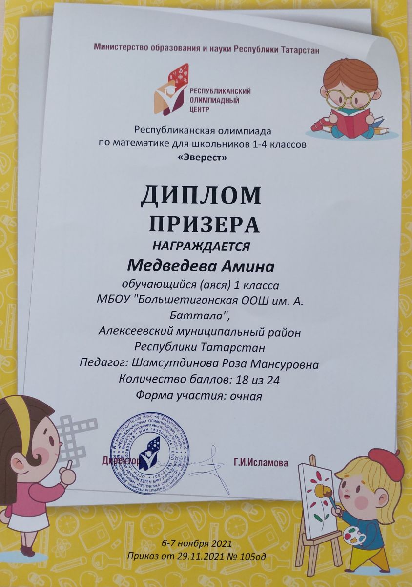 Ученица 1 класса Медведева А. (педагог Р.М.Шамсутдинова) принимала участие в Республиканской олимпиаде по математике для школьников 1-4 классов "Эверест" и стала призером.Поздравляем!