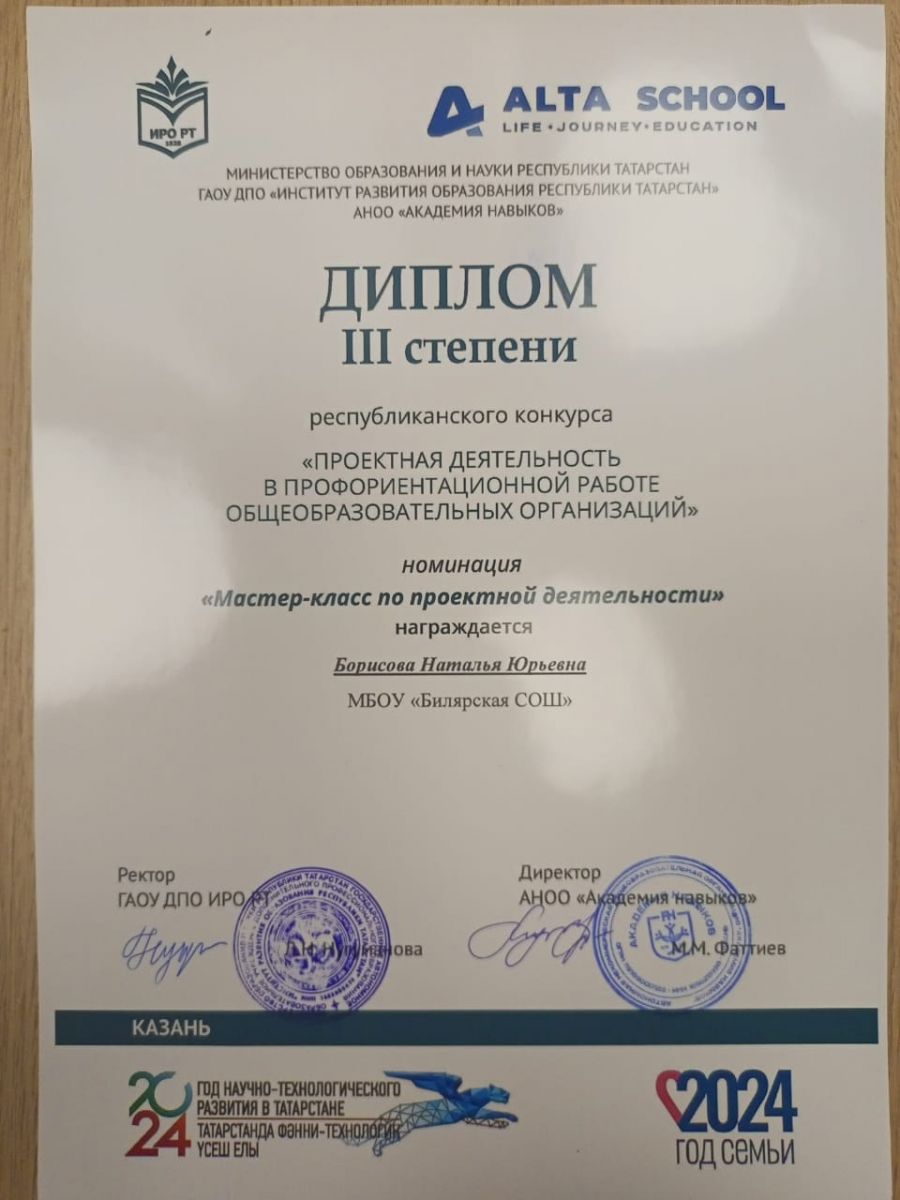 Общ Биләр мәктәбенең тәрбия буенча директор киңәшчесе Борисова Наталья Юрьевнаны гомуми белем бирү учреждениеләрендә проект эшчәнлеге өлкәсендә һөнәри юнәлеш бирү эше буенча республика конкурсында «проект эшчәнлеге буенча Мастер-класс»номинациясендә лаеклы треть өченче урын алуы белән котлыйбыз. Сезнең тырышлыгыгыз яхшы бүләк белән билгеләнде! ???? Молодцы! Гор Сезнең Белән Горурланабыз⭐
