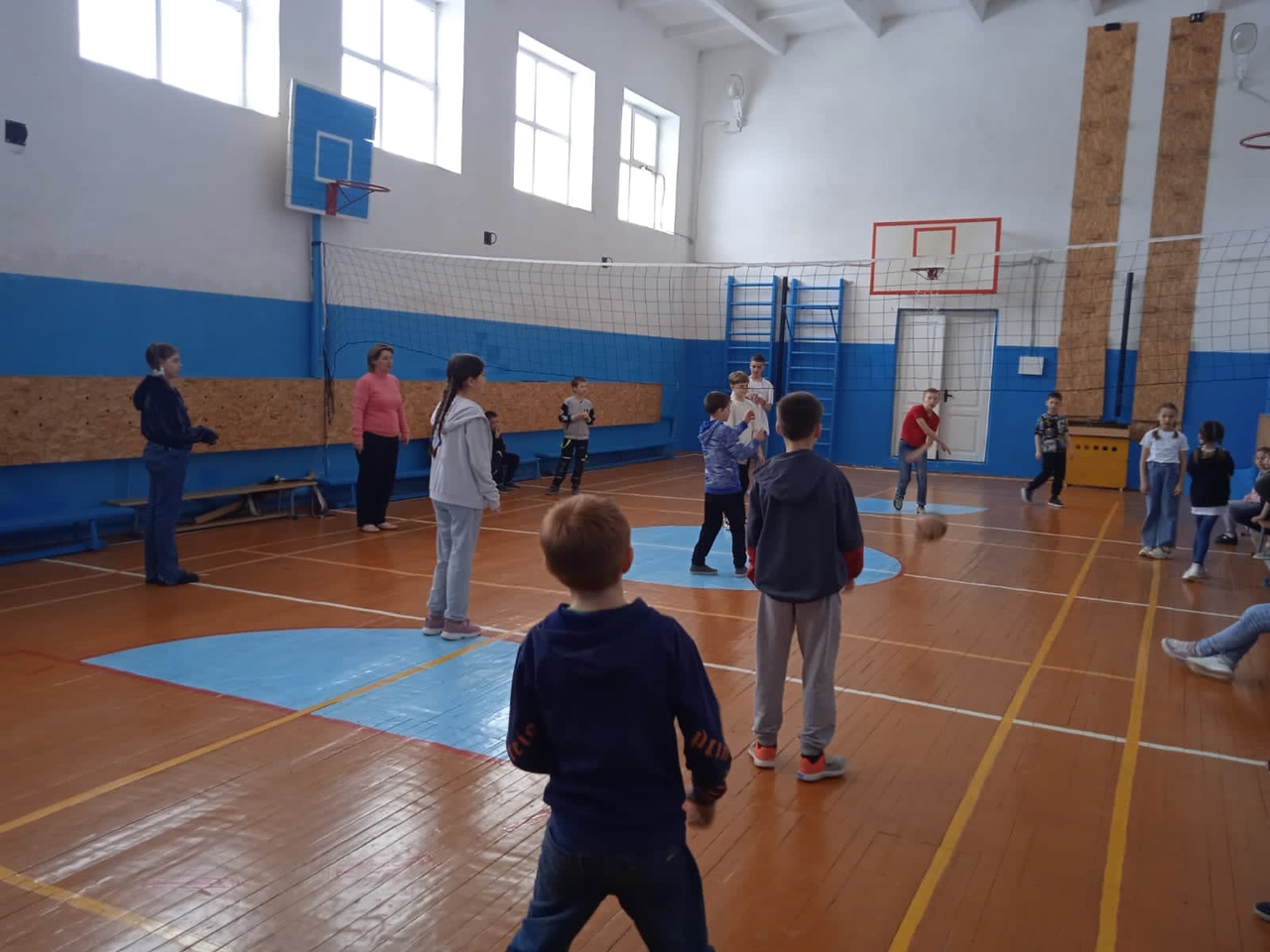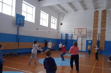 В спортзале играли в волейбол и пионербол. Девочки соревновались в прыжках через скакалку. -