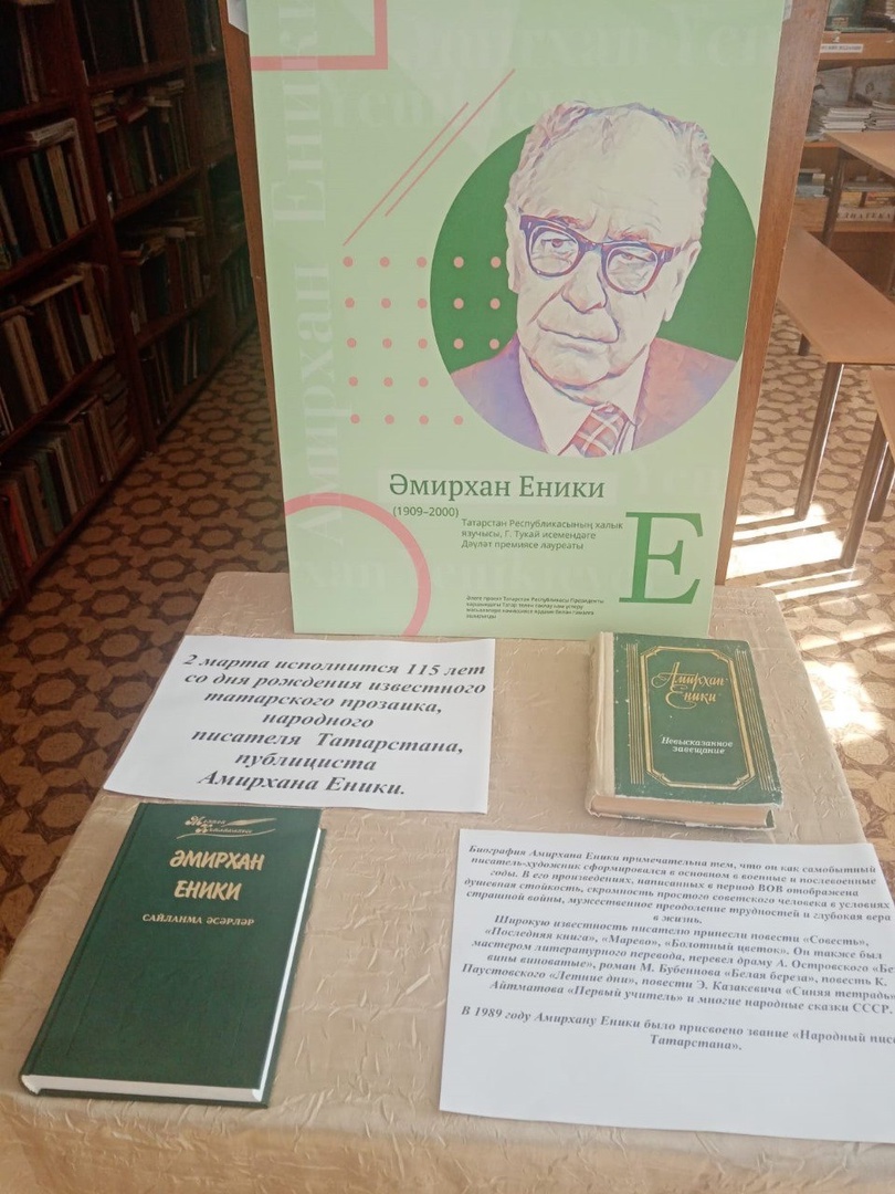 2 март - танылган татар прозаигы, халык прозаигының тууына 115 ел Татарстан язучысы, публицист Әмирхан Ениики. Биләр мәктәбе китапханәсендә язучының китапларыннан күргәзмә оештырылган.