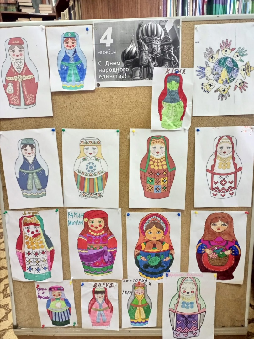 В преддверии праздника Дня народного единства, советник по воспитательной работе и библиотекарь МБОУ "Билярская СОШ" с обучающимися пришкольного лагеря, разукрашивали матрешек в костюмах разных национальностей и была организована выставка.