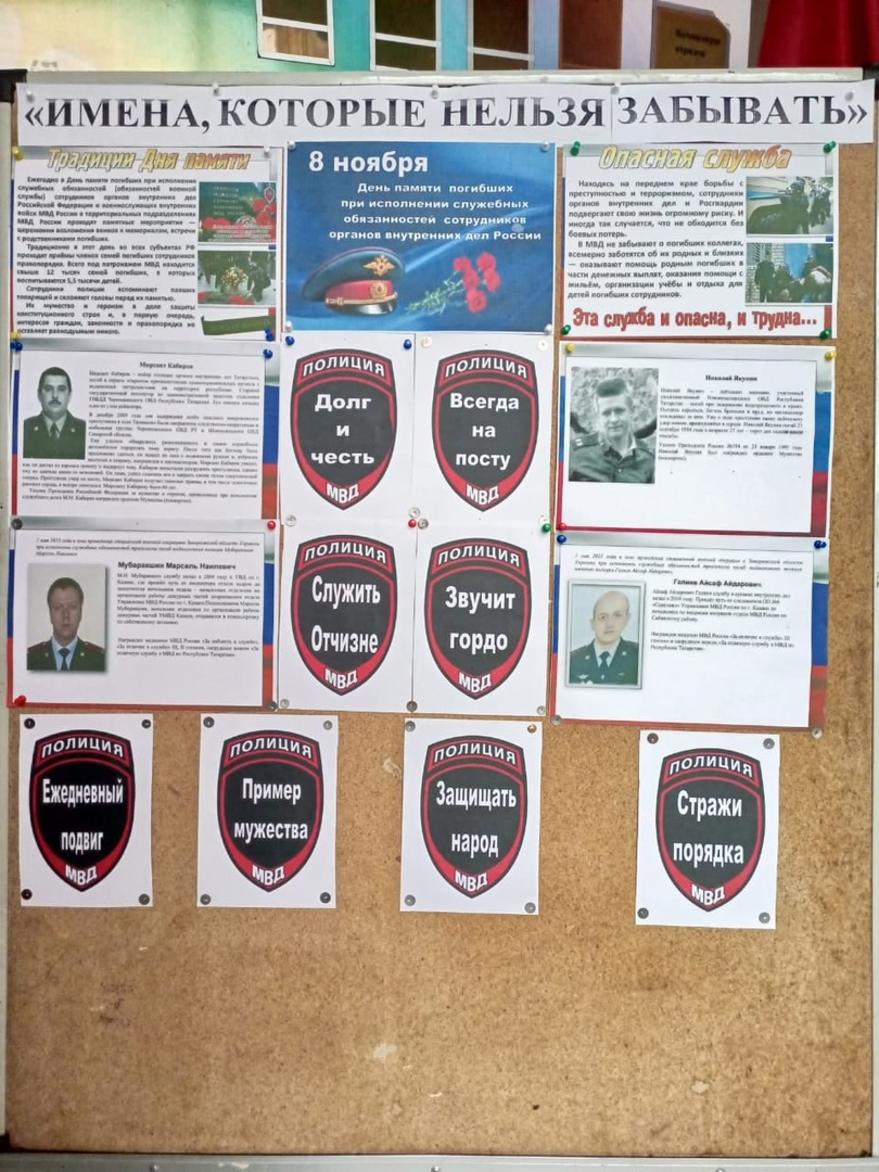 8 ноября, прошло мероприятие, посвящённое дню памяти жертв органов внутренних дел при исполнении служебных обязанностей сотрудников органов внутренних дел России. Ребята познакомились с профессией полиции, которая одна из самых опасных в современном мире. Была организована информационная выставка сотрудников Республики Татарстан, погибших при исполнении должностных обязанностей, а также при противоборстве с преступниками, подвергая свою жизнь огромному риску.