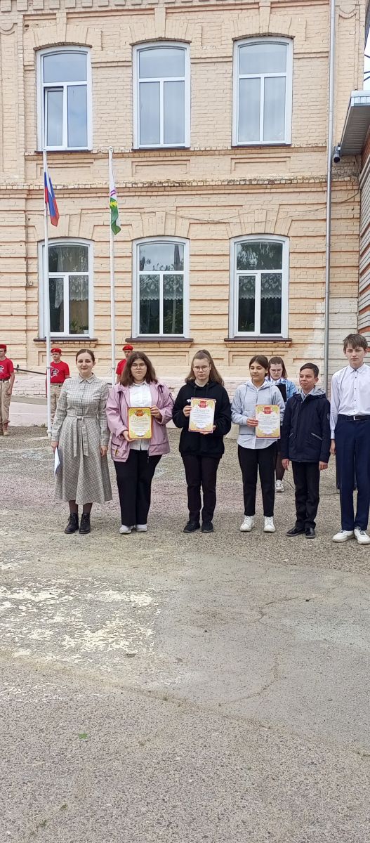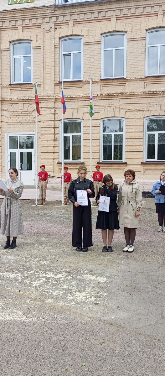 15.05 состоялась очередная еженедельная линейка поднятию Государсивенных флагов. На построении присутствовали обучающиеся с 1-11 классы, педагоги и администрация школы. Директор школы Климова М. А. подвела итоги прошедшей недели и поздравила обучающихся и их руководителей, занявшие призовые места в конкурсах. Учащиеся 5-го класса выступили с новостями о знаменательных датах прошедшей и предстоящей недели. Далее обучающиеся прошли в свои кабинеты на внеурочное занятие "Разговор о важном".