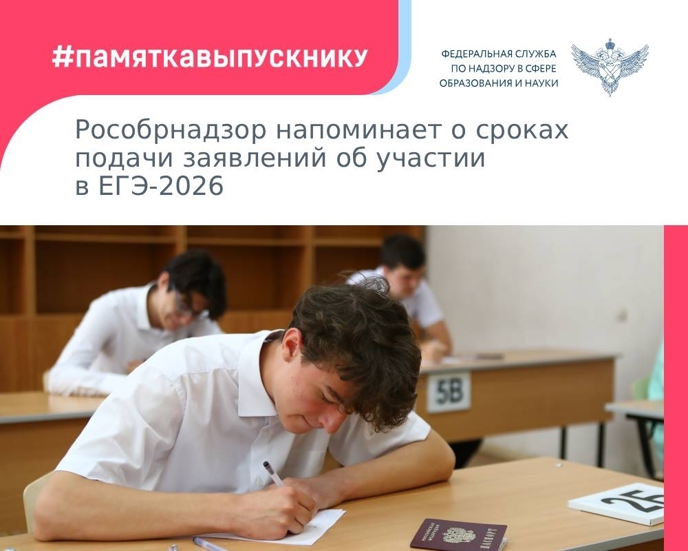 Рособрнадзор напоминает: заявление об участии в ЕГЭ-2026 нужно подать до 1 февраля. Поскольку 1 февраля – воскресенье, срок подачи заявления продлевается до 2 февраля включительно.