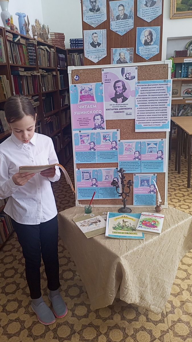 3.03 в рамках Года педагога и наставника, в честь 200- летия Константина Дмитриевича Ушинского, одного из основателей российской педагогики, "учителя русских учителей", детского писателя множественных рассказов, в школьной библиотеке состоялась выставка "Читаем Ушинского".