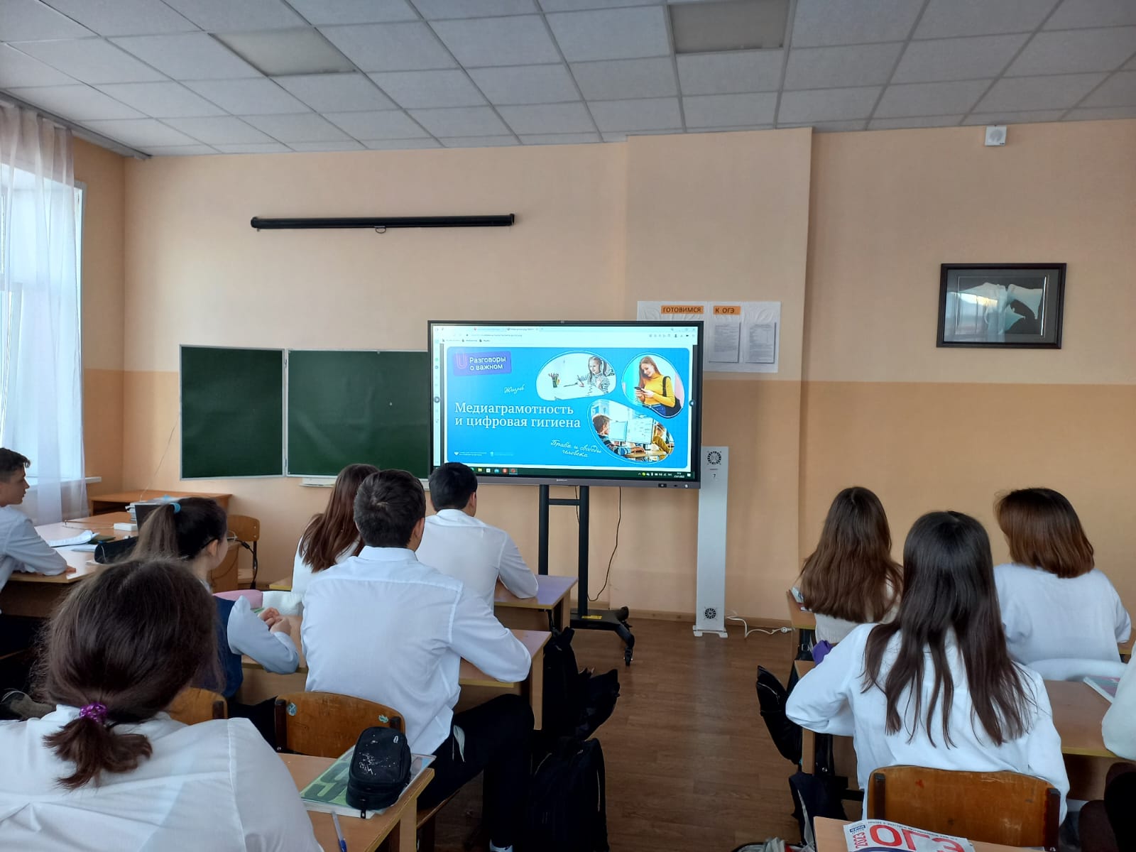 23.01 после церемонии поднятия Государственных флагов и исполнения гимна, в школе среди прошли уроки в рамках проекта Разговор о важном на тему: "Медиаграмотность и цифровая гигиена".