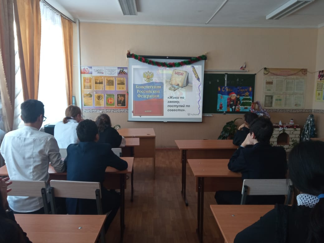 12 декабрьдә 1-11 сыйныф укучылары белән "Конституция көне"темасына Мөһим сөйләшү узды. Балалар Россия Федерациясе Конституциясенең төп нигезләмәләре турында белделәр. Гражданнарның бурычлары һәм хокуклары белән таныштылар.