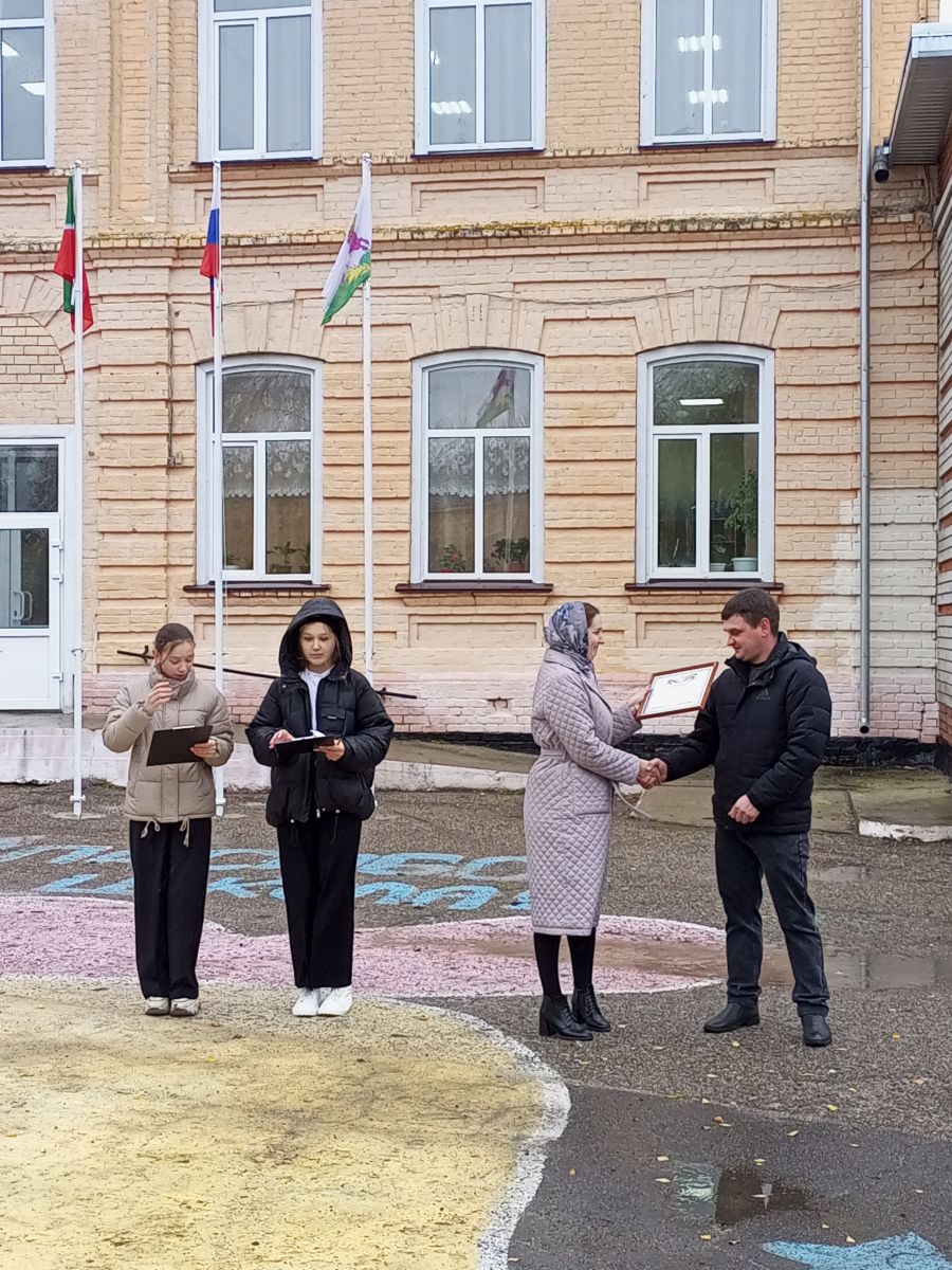 На торжественной еженедельной линейке, церемонии поднятия Государственных флагов, была предоставлена возможность участнику Совета отцов, победителю в военизированной эстафеты, посвященной Дню отца Шевелеву Александру Николаевичу, и участнику олимпиады по избирательному праву Кирилловой Дарьи и победителю куонкурса Мальцевой Камилле. На линейке вручили благодарственное письмо Шевелеву Александру Николаевичу, за активное участие в деятельности школы и районного Совета отцов.