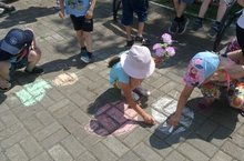 Воспитанники пришкольного оздоровительного лагеря «Радуга» цветными мелками рисовали на асфальте красочные картины мирной жизни.
