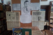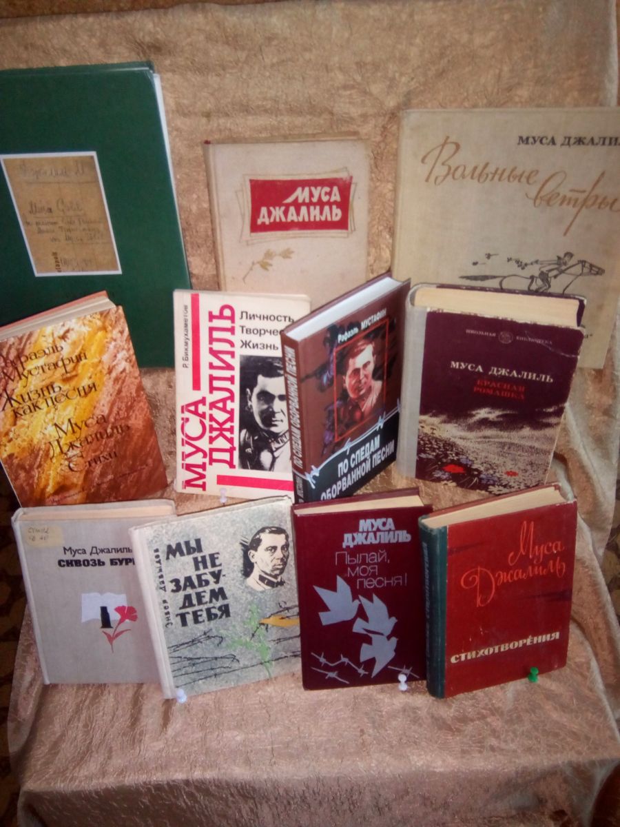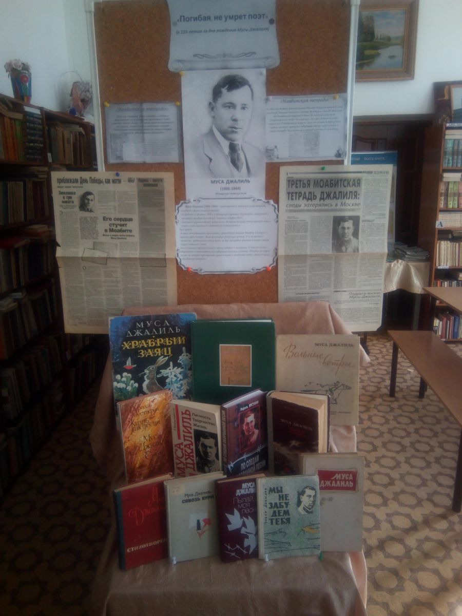 Выставка в школьной библиотеке, к 115-летию со дня рождения Мусы Джалиля «Погибая, не умрет поэт». На выставке были представлены произведения поэта, статьи из газет о его жизни и творчестве.