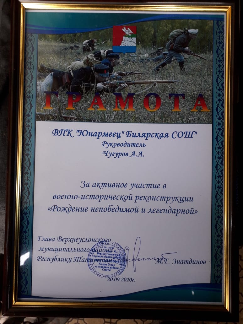 ВПК «Юнармеец» «Билярская СОШ под руководсвом Чугурова А.А. приняли активное участие в военно-исторической реконструкции «Рождение непобедимой и легендарной». Главой Верхнеуслонского района вручены грамоты за активное участие.