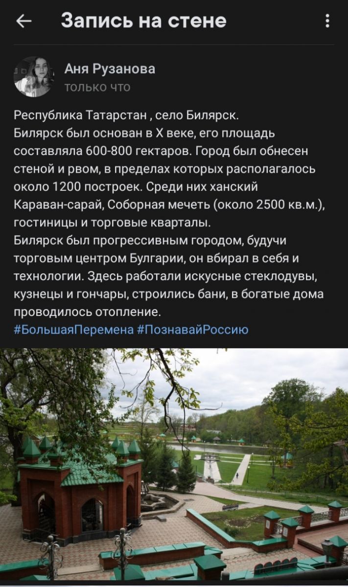 В сообществе «Большая перемена» проходит неделя «Познавай Россию!» Участники сообщества могут совершить онлайн-путешествие по территориистраны, познакомится с достопримечательностями России, узнать культуру гостеприимства и современный туризм. Этой замечательной возможностью воспользовалась ученица 10б класса Рузанова Анна. Она приглашает в онлайн-путешествие по столице Волжской Булгарии, древнему Биляру. #БольшаяПеремена #Познавай Россию -