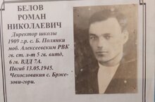 Белов Роман Николаевич был директором школы и учителем русского языка и литературы. Родился в селе Большие Полянки в 1909 году. Образование получил в Казанском педагогическом институте. Вел активную общественную работу , был депутатом районного Совета депутатов. Был призван на фронт в самом начале войны. Воевал в 6 Гвардейской воздушно- десантной дивизии. Погиб освобождая Чехословакию в мае 1945 года.
