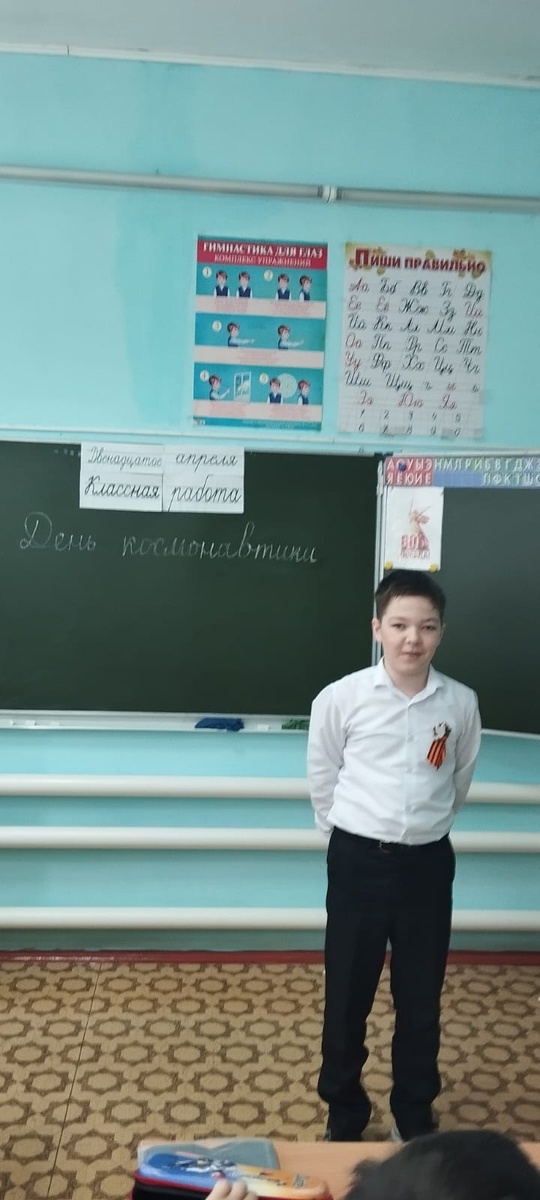 День космонавтики во 2 классе прошёл увлекательно. Ребята делали макеты ракет.Эштә функциональ грамоталылык 12 апрель көнне башлангыч сыйныфларда Космонавтика көненә багышланган"барысы турында да дәрес" темасына дәрес үткәрелде. 4 4-б сыйныфта рус теле дәресендә балалар " җирлеләрнең космоска юлламасы "дип яздылар, әдәби уку дәресендә" космоста беренче кеше "темасына текст укыдылар, текст буенча сорауларга җавап бирделәр, үз сорауларын төзеделәр. Әйләнә - тирә дөнья дәресендә - "Космос ерак һәм якын"танып-белү викторинасы уздырдылар. 3 3б сыйныфы укучылары диктант яздылар "Скафандр"" 4-а сыйныфта Космонавтика көненә багышланган "Барысы турында да" дәресләре узды. Рус теле дәресендә балалар текст белән эшләделәр "Нәрсә ул космос?". Әйләнә-тирә дөнья дәресе вакытында балалар беренче космонавтлар һәм аларның Халыкара космик станциядәге тормышы турында видео карадылар. ИЗО дәресендә укучылар "Космос"темасына рәсемнәр ясадылар. 3-а сыйныфта дәресләрдә Космонавтика көненә багышланган белем бирү эшчәнлеге үткәрелде.Алган белемнәрен балалар үзләренең иҗади эшләрендә һәм рәсемнәрендә ныгыттылар. Косм 2 нче сыйныфта Космонавтика көне мавыктыргыч узды. Егетләр ракета макетлары ясадылар. -