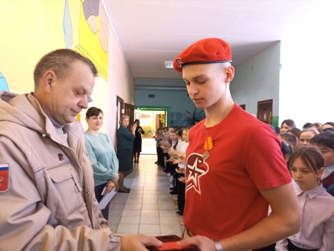 На еженедельной линейке, после поднятия флагов и исполнения гимна Российской Федерации и Республики Татарстан, торжественно закрыли месячник военно-патриотического воспитания почётным награждением Юнармейцев медалями "Юнармейская доблесть" III степени. Начальник штаба Юнармии в Алексеевском районе Чугуров Андрей Анатольевич поздравил ребят с успехами и напомнил о важности продолжения участия в военно-патриотическом деле.
