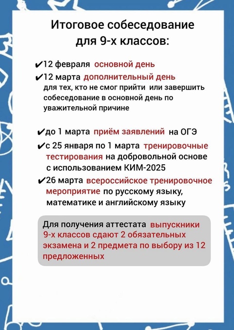 лично в своей школе.Желаем успехов в подготовке!БДИ-2025 тапшыруга гаризалар кабул итү тәмамланырга санаулы көннәр кала. 1 февраль — документларны тапшыруның соңгы көне. Чыгарылыш сыйныф укучылары өчен төп даталарны карточкаларда җыйдылар ???? ???? БДИ яки ОДИНЫ уңышлы тапшыру өчен вакытында гариза бирү мөһим. Моны эшләргә мөмкин: РТ ТР Дәүләт хезмәтләре Порталы аша онлайн; лич шәхсән үз мәктәбендә. Әзерлектә уңышлар телибез!
