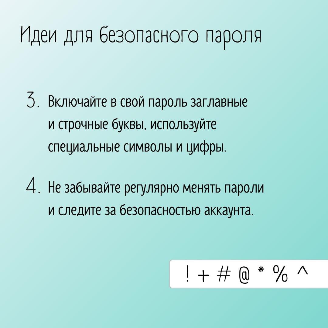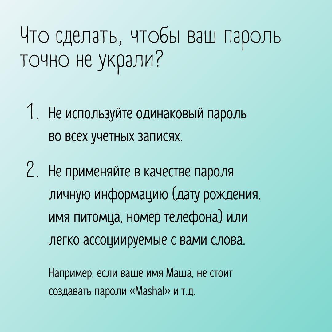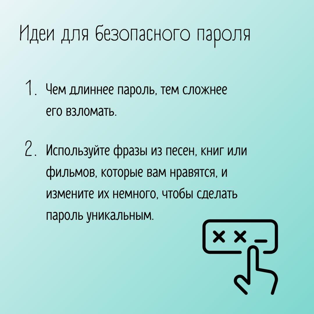 Знаете ли вы, как обезопасить свои личные данные от недоброжелателей?Всем известно, что в настоящее время очень важно защищать свои данные в сети. Поэтому выбор надежного пароля играет важную роль. Делимся советами, как придумать пароль, который взломать будет просто невозможно. Сохраняйте пост и делитесь с друзьями – вместе мы сделаем интернет безопаснее!
