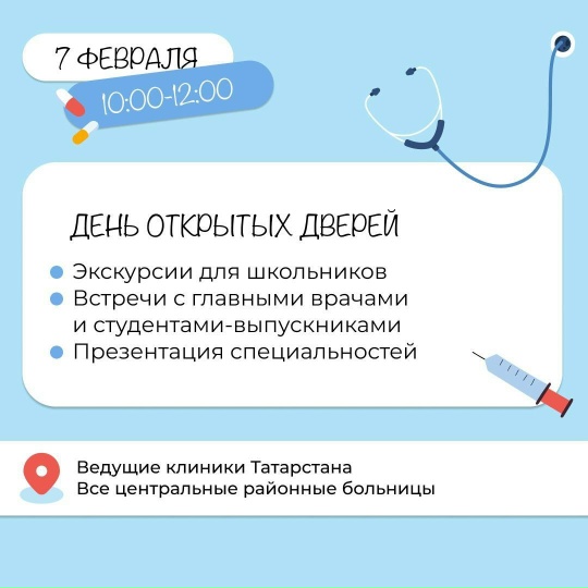 Регистрация clck.ru/3RahLkУкучыларны «Ак халатлы Фарештәләр — Ак халатлы фәрештәләр»фестиваленә чакыралар Табиб карьерасы турында хыялланган балалар медицина дөньясына чума алачак - 7-13 февраль көннәрендә мәктәп укучыларын һәм абитуриентларны әйдәп баручы хастаханәләрнең баш табиблары белән очрашулар, экскурсияләр, мастер-класслар һәм лекцияләр көтә. Сылтама буенча тулы программа clck.ru/3RaWzg Теркәлү clck.ru/3RahLk