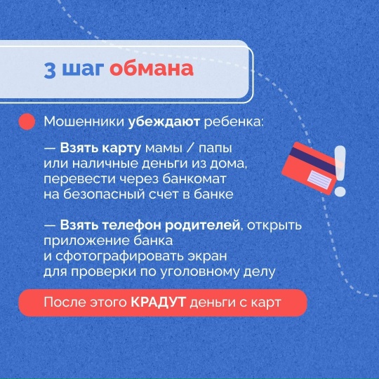 Балаларны кисәтегез - беркемгә дә хәбәрләрдән кодлар әйтергә ярамый Республикада мошенникларның балалар һәм яшүсмерләрне алдау очраклары ешайды. Башта алдыйлар, аннары куркыталар, ата-аналарының документларын, Саклык урыннарын төшерергә таләп итәләр, аннары акча урлыйлар. Алдауның киң таралган схемалары турында карточкаларда сөйләделәр. Укып чыгыгыз һәм дусларыгыз һәм танышларыгыз белән уртаклашыгыз. Һәрвакыт исегездә тотыгыз: смстан код сорыйлар — димәк, мошенниклар. Шунда ук трубканы куегыз!