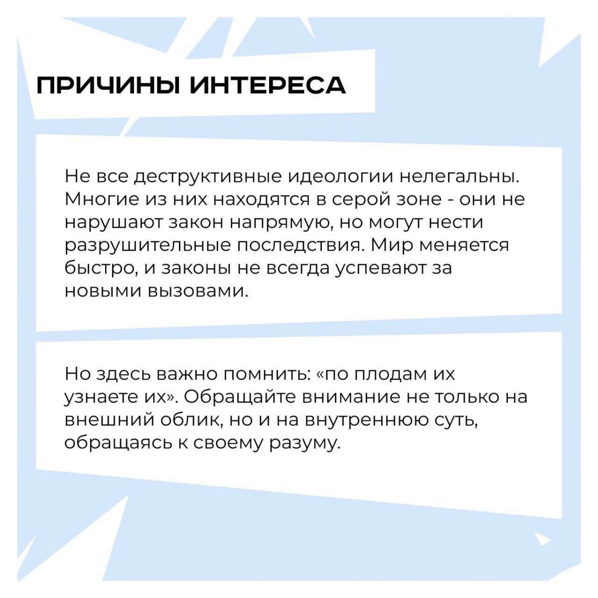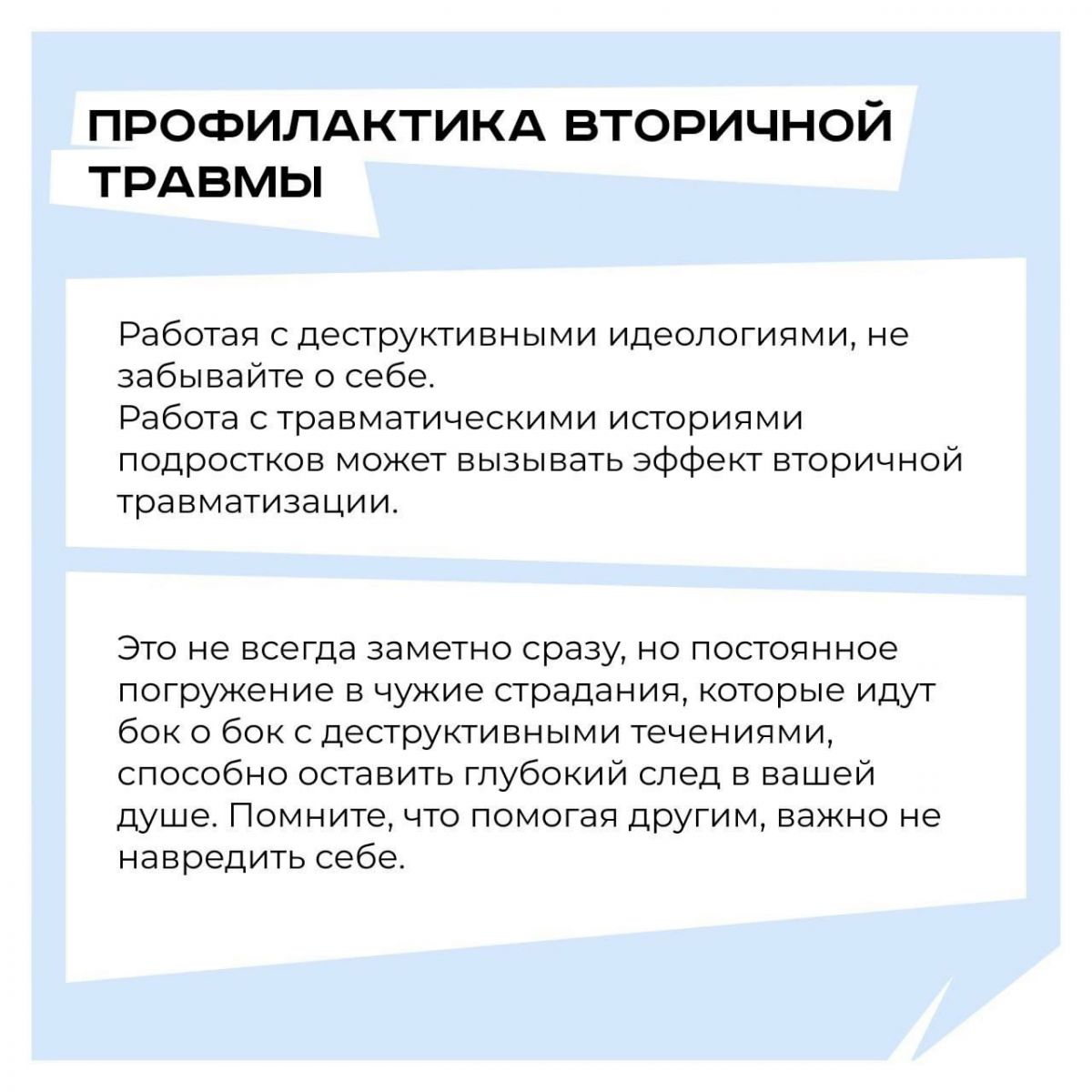 Подписывайтесь на канал Родителям о важном! (t.me/secureyour...) для рекомендаций по профилактике радикализма среди молодежи и других актуальных тем.Деструктив идеология-ул үзендә җимергеч нәтиҗәләр китерә торган кыйммәтләр системасы. Гадәттә ул гаделлек яки җәмгыятьтә үзгәрешләр идеяләре белән кешеләрне үзенә тарта. Яшүсмерләр арасында деструктив идеологияләрне нәтиҗәле профилактикалау өчен комплекслы якын килү мөһим, барысы да беренче карашка тоелганча ук гади түгел бит. Бу язмада сезгә бу күренешнең төп, ләкин кайчак сизелми торган аспектларының берничә мисалын китерик. ___ Күбрәк файдалы материаллар Мөһим нәрсәләр турында әти-әниләрегезгә каналга язылыгыз! (t.me/secureyour...) яшьләр арасында радикализмны профилактикалау буенча киңәшләр һәм башка актуаль темалар өчен.