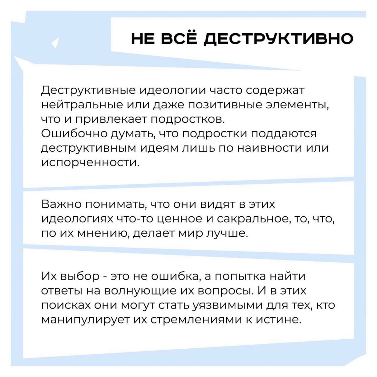 Деструктивная идеология - это система ценностей, которая несет в себе разрушительные последствия. Обычно она притягивают к себе людей идеями справедливости или изменений в обществе.Для эффективной профилактики деструктивных идеологий среди подростков важен комплексный подход, ведь все не так просто, как может показаться на первый взгляд. В данной публикации приведем вам несколько примеров ключевых, но порой незаметных аспектов этого явления.