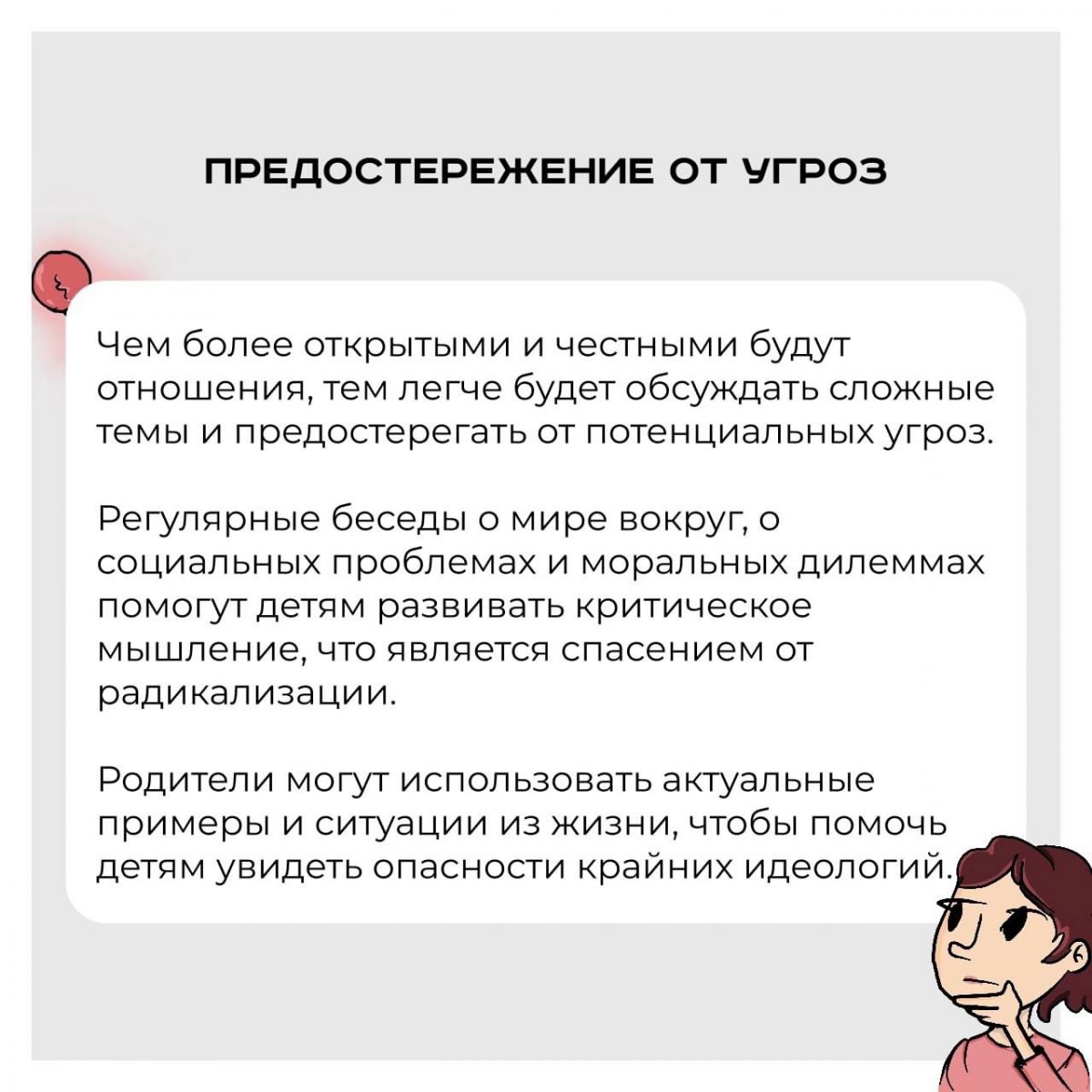 Родители, как правило, стремятся к тому, чтобы ребенок открыто делился своими мыслями которые, формируют его личность.Такие связи создают атмосферу безопасности и поддержки, что особенно важно в подростковом возрасте, когда молодежь ищет свое место в обществе.В условиях, когда радикальные идеи могут легко проникать в умы подростков, доверительный диалог становится ключевым элементом, позволяющим обсуждать сложные темы, выявлять тревожные изменения в поведении и противостоять возможному влиянию экстремистских взглядов.