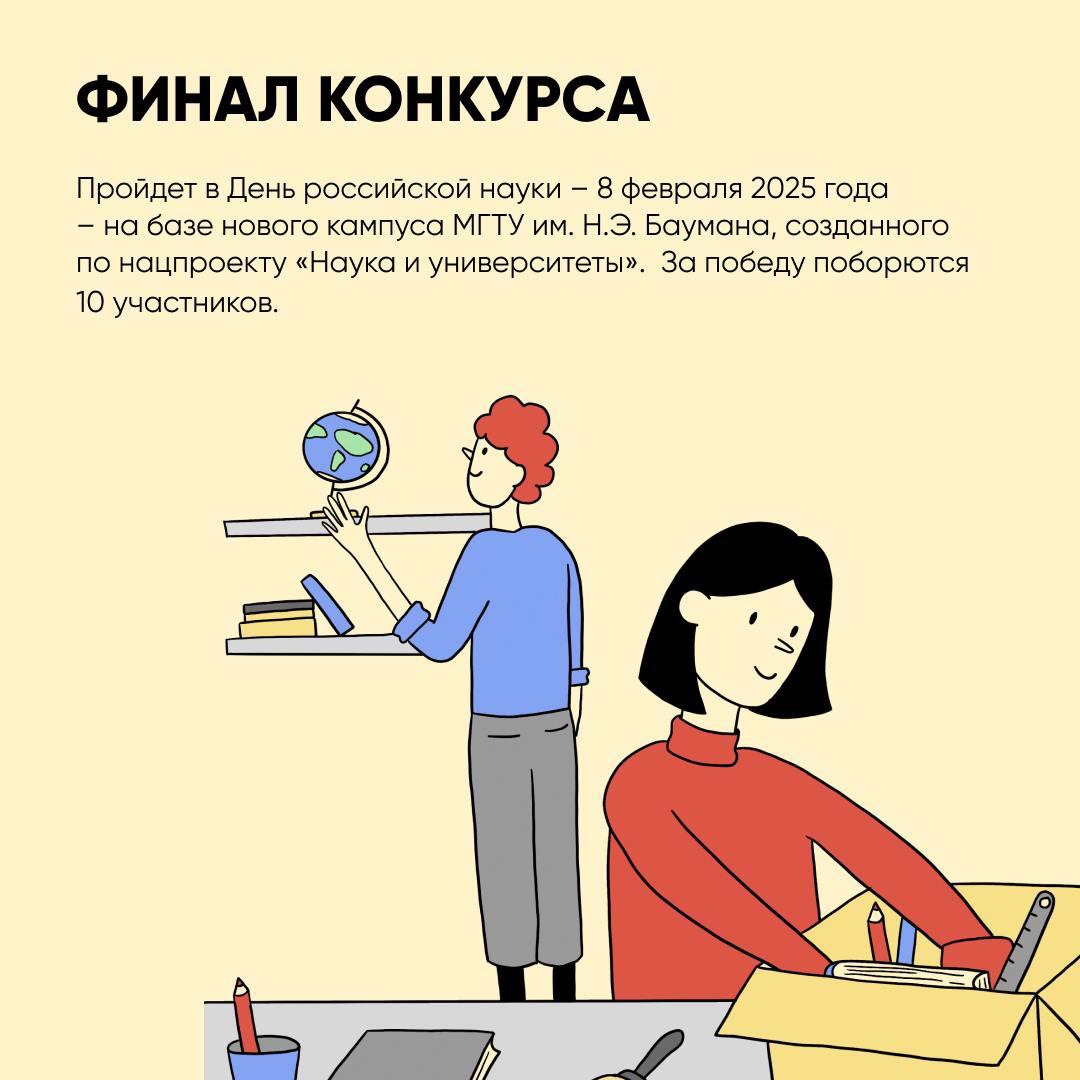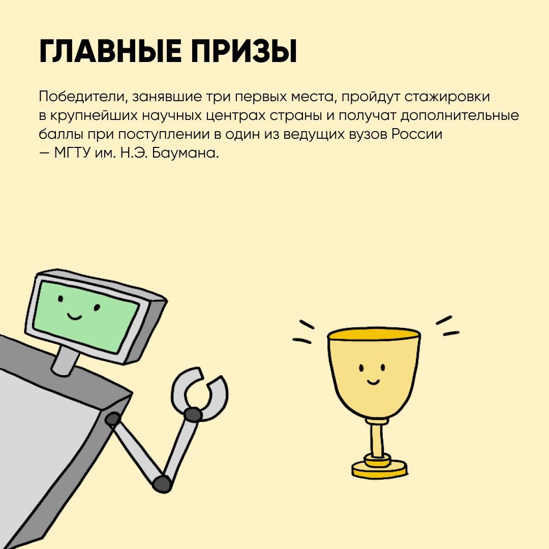А победители, которые займут первые три места, смогут пройти стажировку в крутых научных центрах нашей страны и даже получить дополнительные баллы при поступлении в Бауманку!