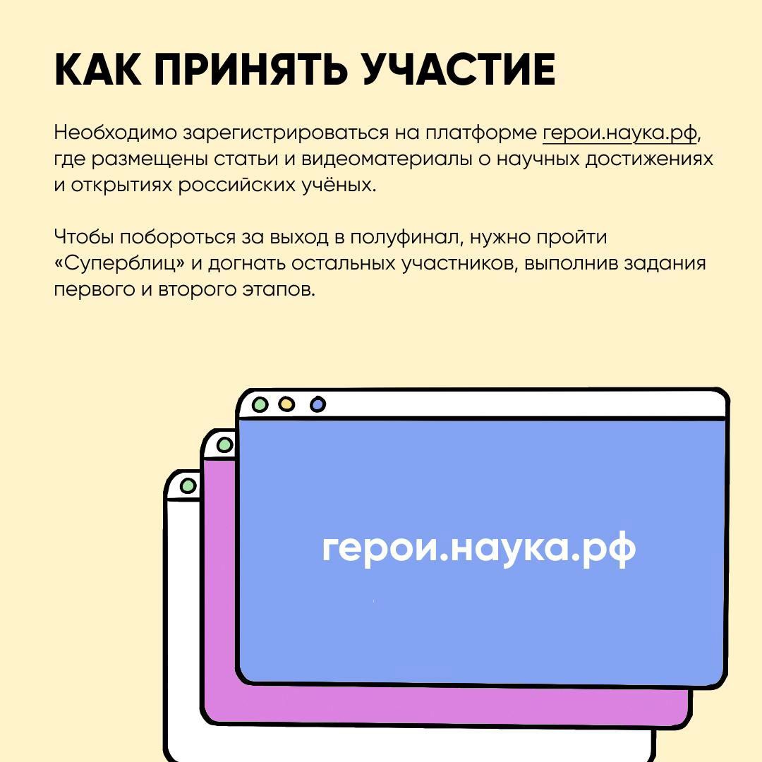 Что нужно сделать? Зарегистрируйтесь на платформе герои.наука.рф, пройдите «Суперблиц» и выполните задания первых двух этапов, если еще не сделали этого. Если справитесь – окажетесь среди 100 лучших участников и получите шанс выйти в полуфинал!